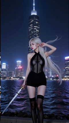 The image shows a young woman standing in front of a city skyline at night. She is wearing a black bodysuit with a plunging neckline and thigh-high stockings. She has long white hair that is flowing in the wind and is holding a sword in her right hand. The woman is standing on a concrete platform with a body of water in the background. The city skyline is lit up with colorful lights and there is a tall skyscraper in the distance. The sky is dark and the overall mood of the image is dramatic and mysterious.