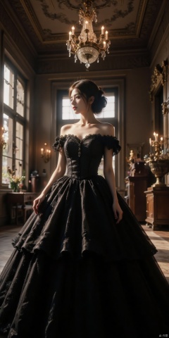 Wide-angle photo,fish eye lens,15mm lens,ultra low angle shot,giorgioarmani design,IMG_1025.HEIC of a high-resolution photo,everyday scene image,dim photo,dark lights,This photograph features a young woman with fair skin and dark hair styled in an elegant updo standing on the stair with dymatic pose,wearing an elaborate black ball gown with intricate lace details and a voluminous train.She wore an ultra-long train gown at the wedding The gown is adorned with sparkling embellishments,adding a touch of glamour. She stands in an opulent,grand hallway with ornate baroque architectural elements,including tall arched windows,gold accents,and a chandelier hanging from the ceiling. The lighting is a mix of natural light from the windows and artificial light from the chandelier,creating a warm,luxurious ambiance. The camera angle is slightly low,emphasizing the grandeur of the gown and the woman's poised stance. The composition uses leading lines from the hallway's perspective,drawing the viewer's eye towards the woman and the chandelier,creating a sense of depth. The overall style is reminiscent of classic European elegance,with a hint of modern fashion photography. highly detailed,ultra-high resolution,32K UHD,sharp focus,best quality,masterpiece,unconventional supreme masterpiece,masterful details,intricate details,soothing tones,high contrast,natural skin texture,soft light,sharp,masterpiece,best quality,(ray tracing),sunlight,ultra-realistic,high dynamic range,photoreal,epic realistic,shadows,(This is a real high-definition photo:1.1),with professional photography and high resolution,contrast,layered colors,vivid colors,contrast,offcial art,movie perspective,very aesthetic,disheveled hair,perfect composition,intricate details,moody,epic,photorealistic,color graded cinematic,atmospheric lighting,award film grain,A shot with tension,(Visual impact,giving the poster a dynamic and visually striking appearance:1.2),