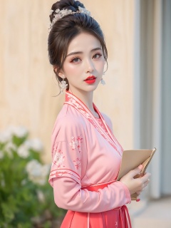 1 girl,diamond earrings,with heavy makeup,Moisturizing red lips,eye makeup,black hair,close-up,realistic,solo,<lora:蓝白汉服1.1:1>,red dress,