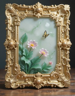 JXY, A meticulously crafted golden frame, enriched with intricate jade designs and boasting a high-gloss finish, encases a stunning jade relief. The relief depicts a lush garden scene, with blooming flowers, verdant vines, and fluttering butterflies. The details are intricate, with swirling lines that give a sense of life and movement. The jade is smooth and translucent, with a gentle, inner glow. The frame's design is inspired by nature, with flowing curves and a luxurious, organic feel. The overall aesthetic is serene and elegant, perfect for a tranquil setting.