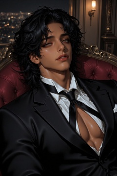 black hair, fluffy hair, solo male, brown eyes, black skin, african american, muscular, handsome, attractive, prince, moonlight, young, 4k, HD, perfect eyes, more detail XL , masterpiece,best quality,amazing quality,very aesthetic,high resolution,ultra-detailed, newest, dark apartment background, depth of field, volumetric lighting, pretty, hairy chest, volume hair, princly attire, sexy, college aged, gala background, laying back, looking at viewer, mouth closed, hair tied back