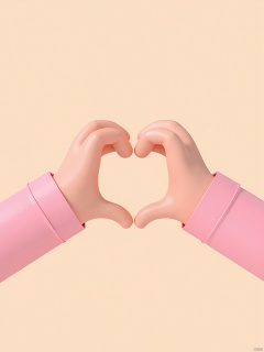 3DYS, A minimalist 3D rendering of two hands forming a heart shape, with the hands positioned in the center of the image and the heart shape formed by their fingers. The hands are pale-skinned and the fingers are slightly curled. The hands are wearing pink sleeves, and the background is a simple, light beige color. The lighting is soft and even, creating a gentle and calming atmosphere. The image is simple and clean, with a focus on the heart shape formed by the hands.