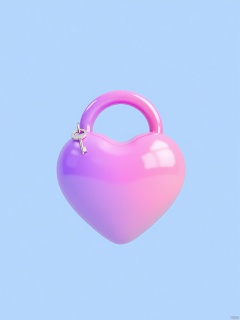 3DYS, Photo of a heart-shaped object with a shiny, reflective surface. The heart is a gradient of pink and purple, with a smooth, glossy texture. It has a single handle on top, shaped like a heart, and a small silver keyhole on the right side. The background is a solid light blue color, providing a contrast to the heart. The image is well-lit, with soft shadows, and has a clean, minimalist aesthetic. The heart is centered in the frame, and the focus is sharp. The overall style is modern and whimsical.
