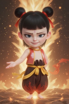 LZNZ, Chinese black and white ink painting,overall illustration style,nezha,A CGI image of a cute,a boy with dark hair in buns,wearing a red and gold outfit with a sash,and red ribbons flowing around her. he has a wide,toothy grin and a small red dot on her forehead. His feet are on fire,the background is a towering flame,under my feet are rolling giant waves,