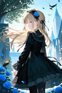 1girl, solo, long hair, dress, blue eyes, gothic lolita, petals, lolita fashion, black dress, flower, hair ornament, hairband, pantyhose, brown hair, long sleeves, hair flower, outdoors, scenery, looking back, black pantyhose, looking at viewer, blonde hair, from behind, profile, standing, rose, building, frills, ribbon, blue flower, goth fashion, bird, from side, sky, cowboy shot, floating hair, church, closed mouth, blue rose, hair ribbon, wind, black ribbon, black hairband, sunlight, frilled dress, braid, tree, day, city