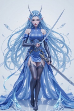 1girl, solo, long hair, breasts, looking at viewer, thighhighs, gloves, dress, holding, bare shoulders, jewelry, medium breasts, very long hair, standing, full body, weapon, earrings, boots, detached sleeves, sleeveless, pointy ears, black gloves, elbow gloves, sword, hand up, fingerless gloves, water, black footwear, holding weapon, high heels, thigh boots, holding sword, elf, high heel boots