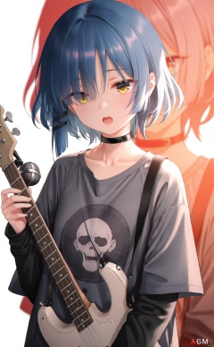 yamada ryo,1girl,blue hair,bass guitar,microphone stand,instrument,solo,microphone,yellow eyes,shirt,short hair,white background,music,mole,simple background,holding instrument,mole under eye,holding,hair ornament,black shirt,long sleeves,eyes visible through hair,grey shirt,t-shirt,guitar,hairclip,upper body,collarbone,layered sleeves,open mouth,short sleeves,playing instrument,short over long sleeves,singing,