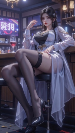 Shot from side and bottom, ultra low angle, bottom view, (full body), black hair, long hair, looking at the audience, beautiful legs, long legs, sitting on a high stool, black heels, intricate details, black pantyhose, Grey gloss, (intricate details white trench coat), black t-shirt, long sleeves, incomparable huge boobs, best quality, amazing, artistic masterpiece, exquisite, ultra high resolution, ultra detailed, highly detailed, professional lighting , sleepy, half-closed eyes, relaxation, bar, stage lighting, neon lights, girl Harajuku style fashion, Tulsa decoration, fashion sense, head slightly raised, arrogant eyes, proud expression.