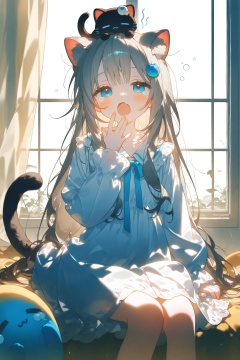 konya666,1girl,animal ears,blue eyes,cat ears,cat girl,cat tail,creature,creature on head,curtains,dress,fang,grey hair,hair ornament,long hair,long sleeves,looking at viewer,open mouth,sitting,sleepy,tail,tears,virtual youtuber,white dress,window,yawning,