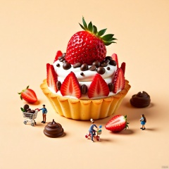 Miniature_photography,A miniature scene full of creativity and fun. In the center of the screen is a huge dessert that looks like a beautifully decorated egg tart. The bottom of the egg tart is a golden puff pastry, topped with white cream adorned with fresh strawberry slices, chocolate chips, and chocolate beans. At the top, there is also a whole large strawberry, brightly colored and mouth watering. There are several miniature dolls around the dessert. On the left is a small doll wearing blue clothes, seemingly reaching out to grab chocolate beans from the dessert; On the right is a small doll pushing a shopping cart filled with strawberries, and next to it is a small doll riding a small tricycle, as if participating in a joyful activity related to desserts. The background is a soft light brown color without excessive decoration, making desserts and dolls the focus of the picture. The entire scene creates a magical atmosphere by combining giant desserts with miniature dolls, as if entering a fairy tale like food world, giving people a sweet and pleasant feeling.,Microphotography,a wonderful microscopic world