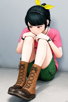 1girl,Pink t-shirt,ponytail,Hair ribbon,Green shorts,boots,best_legs_up