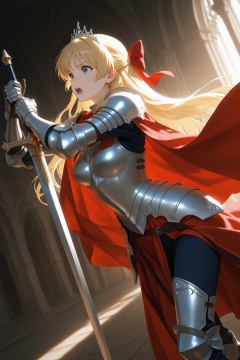 masterpiece,best quality,amazing quality,very aesthetic,absurdres,newest,extreme aesthetic,in the style of fashion photography,light particles,cinematic lighting,Visual impact,sharp focus,Emotionalization,depth of field,dutch angle,scenery,minako aino,blonde hair,blue eyes,bow,hair bow,half updo,long hair,red bow,tiara,medium breasts,sunrise stance,weapon,sword,solo,open mouth,holding weapon,holding,holding sword,knight,armor,cape,shoulder armor,gauntlets,helmet,pauldrons,red cape,
