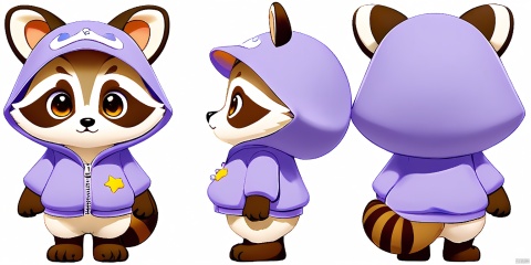 SST, ip design, is presented from three perspectives: front, back and side. The background is pure white. A quirky cartoon raccoon with fur dyed in a soft lavender shade, eyes twinkling in amber hues, and a belly marked with creamy white patches. The raccoon boasts wide, expressive eyes and pointy, fur-lined ears. It wears a cozy, navy blue hoodie adorned with yellow stars, and a matching cap with ear flaps.