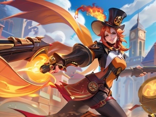 YXMX, with a mane of fiery orange hair, sports crimson and black steampunk armor. She holds a dual-barreled pistol that fires glowing amber bullets. The environment is a Victorian-era cityscape, filled with clockwork gadgets and swirling fog.