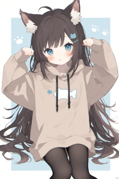 masterpiece,best quality,high quality,loli,chromatic_aberration,Light Blue Theme,1girl, solo, long hair, looking at viewer, blush, bangs, blue eyes, brown hair, hair ornament, long sleeves, white background, animal ears, very long hair, ahoge, pantyhose, parted lips, hairclip, puffy sleeves, cat ears, hood, :o, animal ear fluff, sleeves past wrists, black pantyhose, hands up, hoodie, feet out of frame, hood down, cat girl, clothes writing, two-tone background, puffy long sleeves, drawstring, cat hair ornament, fish hair ornament, brown hoodie