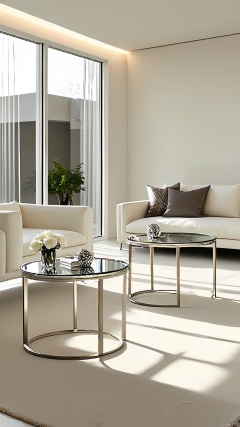 SNSJ, showcasing glass-topped side tables, brushed nickel lighting, monochrome photography, sleek mirrored walls, a skylight with sheer shades, abundant natural light, crisp white walls, modern lines, chic living room, late-night gatherings, contemporary glam, sharp reflections.