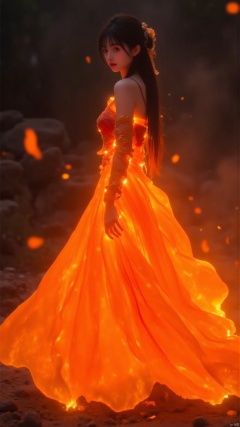 The image shows a young girl standing on a rocky surface with a fiery background. She is wearing a long, flowing orange dress that is flowing in the wind. The dress has a high neckline and long sleeves, and the skirt is full and flowing. The girl has long dark hair that is styled in loose waves and is looking off to the side with a serious expression on her face. The background is filled with orange and yellow flames, creating a dramatic and fiery atmosphere. The overall mood of the image is dark and mysterious.. `(Ultra HD 8K cinematic portrait:1.9), fierce warrior queen engulfed in sentient flames, living fire dress with: