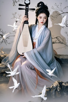 1girl, solo, long hair, looking at viewer, black hair, hair ornament, long sleeves, dress, holding, jewelry, sitting, earrings, wide sleeves, bird, chinese clothes, instrument, music, playing instrument, holding instrument, hanfu, lute \(instrument\),jinghongzy