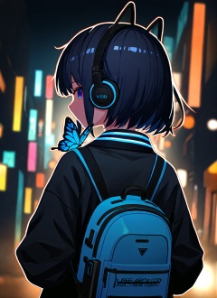 (back view of 1girl with headphone looking front) at very far side of the very crowdy noisy city in the night), chibi style character, use vivid color, high contrast image, thick outline , cinematic lighting, high detail, vibrant atmosphere, masterpiece, best quality, amazing quality, very aesthetic, absurdres, newest, BTRLighting, small butterfly on shoulder,
