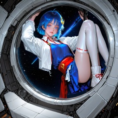 star \(sky\), space station, floating hair, black theme, blue eyes, looking at viewer, backlighting, vignetting, depth of field, round image, window, glass, reflection,