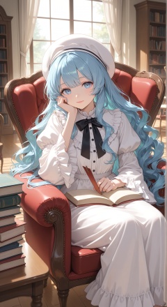 1girl, indoors, looking at viewer, frills, white dress, black bow, juliet sleeves, open book, closed mouth, bookshelf, curtains, book stack, long hair, chair, very long hair, wide sleeves, holding, sitting, frilled shirt collar, knees up, window, on chair, wooden floor, blue hair, black bowtie, solo, book, bow, head rest, tablecloth, armchair, long sleeves, feet out of frame, table, wavy hair, hand on own cheek, holding bookmark, pink lips, couch, day, light smile, sunlight, blue eyes, dress, library, puffy sleeves, bowtie, hand up, white headwear, masterpiece, best quality, highres, absurdres, watercolor \(medium\)
