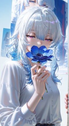 1girl, looking at viewer, holding a big blue flower, blue hair, white shirt, nail polish, purple eyes, blue eyes, eyelashes, long sleeves, white hair, hand up, hair between eyes, half-closed eyes, blue theme, cinematic composition, ultra-detailed, high-quality(artist:quasarcake:0.8),extreme aesthetic,(wlop:0.6),masterpiece,best quality,good quality,newest,very aesthetic,absurdres,Visual impact,A shot with tension, ultra-high resolution,32K UHD,sharp focus,best-quality,masterpiece,Emotionalization,unconventional supreme masterpiece,masterful details,temperate atmosphere,with a high-end texture,in the style of fashion photography, (alzi xiaomI:1.2),(mogumo:1.1),(good hands, nice hands:0.5),giving the poster a dynamic and visually striking appearance,impactful picture,offcial art,colorful,movie perspective, masterpiece,best quality,amazing quality,very aesthetic,absurdres,best quality,newest