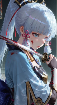 (visual captivating:1.2),(breathtaking visual depth:1.4),ultra-high resolution,32K UHD,sharp focus,best quality,masterpiece,Emotionalization,unconventional supreme masterpiece,masterful details,temperate atmosphere,high-end texture,in the style of fashion photography,(Visual impact:1.2),giving the poster a dynamic and striking appearance,(impactful picture:1.5),official art,colorful,movie perspective,amazing quality,very aesthetic,absurdres,extreme aesthetic,(wlop:0.6),honjou,raita,lack,rella,wanke,(artist:quasarcake:0.8),a shot with tension,.,1girl,solo,cute,simple_background,portrait,heterochromia, 1girl,solo,long hair,bangs,blue eyes,gloves,ribbon,holding,blue hair,hair ribbon,ponytail,weapon,sidelocks,japanese clothes,black gloves,sword,blunt bangs,holding weapon,armor,from side,blood,holding sword,katana,tassel,bridal gauntlets,tress ribbon,breastplate,blood on face,light blue hair,japanese armor,blood on clothes,arm guards,blood on weapon,kusazuri,kamisato ayaka,