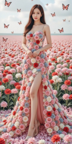The background is ((sea of flowers,with butterflies everywhere.,fluttering butterflies in the sky,colorful auspicious clouds,)), which makes the vibrant colors of the flowers and the dress stand out more prominently.