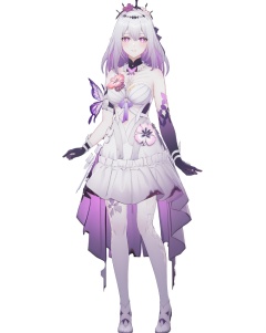 8k,best quality,masterpiece,(ultra-detailed),(high detailed skin),(by nanoless, by misumi \(macaroni\),:0.5),A full-body portrait of a young girl,standing gracefully,pastel art style,high-key lighting,shoujo manga influence,hd quality,delicate details,full body,full shot,standing,looking at viewer,(solo:1.2),simple background,white background,<lora:Castorice-sd-Tanger:0.8>,Castorice \(honkai: star rail\),clothes: Castorice def white dress,black tiara,1girl,purple eyes,purple hair,bangs,black gloves,white pantyhose,