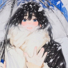 which is partially open and appears to be shielding her from falling snow. The snow is depicted as small white flakes scattered throughout the image. The girl is wearing a light-colored coat