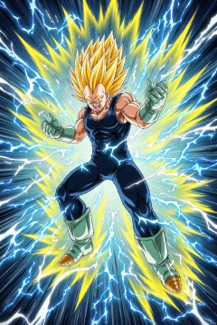 The image depicts a character in a dynamic pose, seemingly in the midst of an intense action sequence. The character has spiky blond hair and is wearing a sleeveless black top and dark pants with green accents. The character is surrounded by vibrant, electric-like energy effects in shades of blue, yellow, and white, which are radiating outward from the character's hands. The background is filled with dynamic, swirling lines and colors, enhancing the sense of motion and power. The overall scene is highly energetic and visually striking, with a focus on the character's powerful stance and the dramatic energy effects surrounding them.