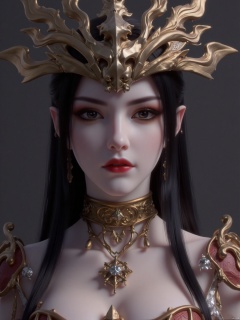 The image depicts a mature woman with great charm,wearing elaborate ornate armor. The armor is mainly gold and red,with intricate designs and patterns. The figure has long black hair and wears a delicate golden headdress with sharp angular elements. The headwear has a star design at the top,and the eyes of the characters are highlighted with dark makeup,with golden glitter eye shadow and bright red lips,giving them an eye-catching appearance. The background is blurred,making the person the focus of the image.,
