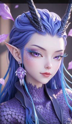1girl,Long hair,,powder eye shadow,Dragon horn,purple pupils,Earrings,fish scale,Pointed ears,looking at viewer,