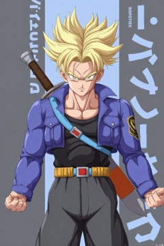 The image depicts a character with spiky blond hair, wearing a blue jacket with a black undershirt, and a yellow belt. The character is holding a sword on their back, and there is a strap across their chest, which appears to be part of a larger set of equipment. The background is a gradient of light blue and gray, with Japanese text on the right side. The text reads "ウィキネン" and "ユジネン" in vertical alignment. The character's expression is serious, and they are standing in a dynamic pose with clenched fists.