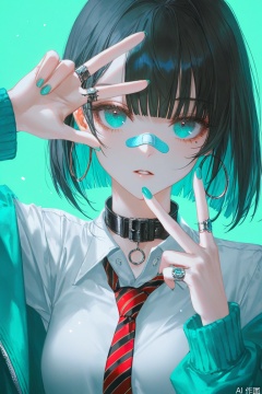 bandaid,1girl,bandaid on face,solo,shirt,bandaid on nose,bandaid on hand,jewelry,necktie,earrings,jacket,collared shirt,looking at viewer,striped necktie,simple background,aqua nails,short hair,aqua background,nail polish,red necktie,aqua jacket,parted lips,upper body,black hair,aqua theme,collar,white shirt,long sleeves,off shoulder,choker,ring,w,green nails,aqua eyes,belt collar,mole,mole under eye,open jacket,fingernails,open clothes,single off shoulder,black choker,sidelocks,diagonal-striped clothes,striped clothes,green jacket,green background,blue eyes,v,black collar,diagonal-striped necktie,blue jacket,hands up,bob cut,blue nails,hoop earrings,