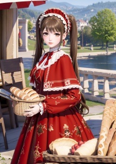 masterpiece,best quality,1girl,basket,bread,solo,food,brown hair,dress,twintails,brown eyes,blurry,blurry background,lolita fashion,baguette,long sleeves,looking at viewer,red dress,holding,holding basket,long hair,outdoors,capelet,floral print,hairband,red capelet,bow,frills,