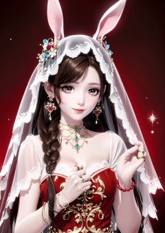 masterpiece,best quality,1girl,jewelry,solo,ring,rabbit ears,animal ears,gem,braid,long hair,earrings,bracelet,hair ornament,upper body,smile,black hair,holding,looking at viewer,veil,brown hair,single braid,dress,red background,lips,closed mouth,