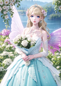 masterpiece,best quality,1girl,jewelry,solo,flower,blurry background,wings,blurry,dress,holding,blue eyes,bouquet,ring,long hair,earrings,detached sleeves,white dress,looking at viewer,holding flower,blonde hair,necklace,bare shoulders,holding bouquet,bracelet,fairy wings,hair ornament,tiara,white flower,beads,fairy,depth of field,