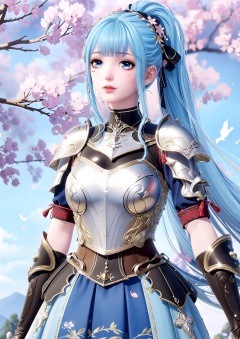 masterpiece,best quality,1girl,Nikki,solo,blunt bangs,long hair,armor,ponytail,blue eyes,blue hair,breastplate,gloves,ribbon,skirt,hair ribbon,light blue hair,sidelocks,mole,hair ornament,cherry blossoms,bird,lips,mole under eye,japanese clothes,arm guards,tress ribbon,armored dress,black gloves,choker,blue skirt,neck tassel,