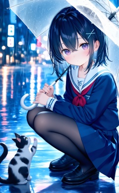 masterpiece,very awa,highres,newest,best quality,high quality,loli,chromatic_aberration,Light Blue Theme,//,1girl,squatting,cat,transparent,umbrella,pantyhose,transparent umbrella,school uniform,holding umbrella,holding,hair ornament,skirt,purple eyes,sailor collar,serafuku,blue skirt,looking at viewer,white sailor collar,neckerchief,rain,black pantyhose,black footwear,red neckerchief,shirt,pleated skirt,black hair,loafers,x hair ornament,shoes,long sleeves,outdoors,solo,blue shirt,blue serafuku,medium hair,hair between eyes,hairclip,animal,closed mouth,crossed bangs,blurry,blush,reflection,blue hair,blurry background,full body,reflective floor,short hair,water drop,//,year_2023,year_2024,//,official art,depth of field,detailed light,blurry background,cinematic lighting,ray tracing,ultra detailed,god rays,backlighting,photo background,chromatic aberration,volumetric lighting,depth of field,blurry background,cinematic lighting,very aesthetic,