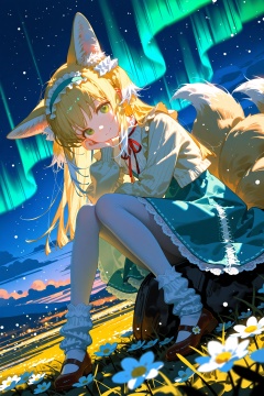 1girl,suzuran \(spring praise\) \(arknights\),(ningen mame:1.1),ciloranko,[sho \(sho lwlw\)],ask \(askzy\),tianliang duohe fangdongye,rhasta,wlop,dynamic angle,dutch angle,head tilt,head rest,animal ears,blonde hair,eyes visible through hair,frilled hairband,frilled skirt,dark,aurora,cloud,green eyes,green hairband,legs up,long hair,long sleeves,looking at viewer,standing,multicolored hair,multiple tails,neck ribbon,official alternate costume,outdoors,plant,red ribbon,ribbon-trimmed skirt,smile,solo,streaked hair,white flower,white pantyhose,white tail,yellow tail,light particles,bloom,depth of field,masterpiece,best quality,good quality,newest,highres,absurdres,(loose socks),night,