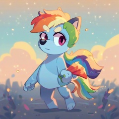 safe_pos, score_9, score_8_up, score_7_up, score_6_up, score_5_up, score_4_up, source_furry, hi res, blurred background, particles, solo, Rainbow Dash, looking at viewer, closed mouth, Bluey style