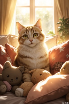 A serene image of a healing cat, its bright eyes shining like warm gemstones, soft fur glistening in the gentle warmth of sunlight filtering through the window, casting a comforting halo around it. The cat's tranquil gaze radiates soothing calmness, as if capable of dispelling all weariness. Surrounded by plush toys and pillows, creating a cozy home environment filled with love, warmth, and tranquility.