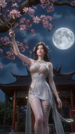 Against the moonlit backdrop of the royal garden, a girl with long, straight black hair stood, one leg bent over her knee, the other out, as if ready to jump. She wore a modern qipao, a high-necked crop top and a short, flowing skirt that accentuated her thighs. The dragon tattoo on her thigh glistens in the moonlight, and as she reaches out to pluck a flower from a cherry tree, her gesture blends serene grace with subtle power.
