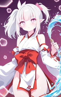 O,Noyu,Torino,0,Spring couplets,red envelopes,1girl,solo,bishoujo,elf,miko,magical_girl,white_skin,shiny_skin,fair_skin,oil,slender,white hair,silver hair,streaked hair,ponytail,Side ponytail,short ponytail,elf ears,pointy_ears,pink eyes,pink eyeshadow,glowing_eye,water_eyes,x-shaped_pupils,bare shoulders,narrow_waist,