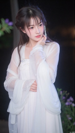 A photograph capturing a person in a white Hanfu with delicate floral patterns and a sheer,semi-transparent outer layer outdoors at night. The attire catches the soft light,creating a gentle,ethereal glow. The blurred background of flowers and grass,combined with the night atmosphere,enhances the dreamy and serene ambiance.(masterpiece),(best quality),(ultra-detailed),illustration,disheveled hair,detailed eyes,perfect composition,moist skin,intricate details,earrings,by wlop,cinematic photo . 35mm photograph,film,bokeh,professional,4k,highly detailed,photograph,50mm . cinematic 4k epic detailed 4k epic detailed photograph shot on kodak detailed cinematic hbo dark moody,35mm photo,grainy,vignette,vintage,Kodachrome,Lomography,stained,highly detailed,found footage,analog film photo . faded film,desaturated,35mm photo,grainy,vignette,vintage,Kodachrome,Lomography,stained,highly detailed,found footage,cinematic still . emotional,harmonious,vignette,highly detailed,high budget,bokeh,cinemascope,moody,epic,gorgeous,film grain,grainy,styled by John Galliano,a fashion model,full body,standing,pure background,fashion poster,vogue,photography by Helmut Newton,Retro Style,Fujifilm Provia 400x,strong sunlight,high contrast,film grain,best details,Deconstruction,.liangyi guang,