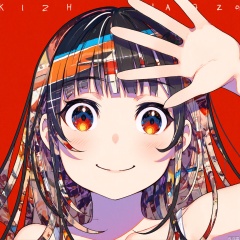 A dynamic anime-style illustration features Mika Piazo, a vibrant character with flowing hair boasting intricate patterns and designs. Large, expressive eyes graduate from red to blue to yellow, radiating liveliness. A sleeveless white top accentuates her cheerful smile, as she holds up one hand in a playful pose, fingers splayed. Against a solid red background, the character's colorful attire pops, drawing attention to her stunning locks.