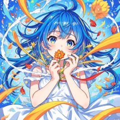 flowing blue hair and is wearing a white dress with intricate patterns. They are holding a small orange flower close to their face