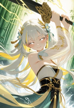 masterpiece,best quality,amazing quality,very aesthetic,absurdres,newest,glowing eyes,streaked hair,glowing inner hair,glowing streaks,1girl,jinhsi \(wuthering_waves\),white hair,blonde_eyes,large_breasts,(upper_body,close-up:1.4),Dynamic pose,串,((aqua and yellow:0.85) but Limited palette:1.2),//,Chinese architecture,Ink,hair flowers,bamboo forest,bamboo,//(long hair),small breasts,smile,((dragon)),Yellow lightning,(makeup,white eyeliner),white eyeshadow,white eyes,(long eyelashes),half-closed eyes,Dragon skirt,blush,holding sword,chinese sword,(dynamic angle:1.2),(hanfu:1.4),chinese clothes,transparent clothes,tassel,chinese knot,bare shoulders,kanzashi,draped silk,gold trim,wind,bokeh,scattered leaves,flying splashes,waterfall,splashed water,looking at viewer,