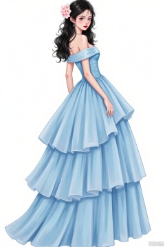 The image depicts a young woman dressed in an elegant, light blue ball gown. The gown features multiple layers of ruffled fabric, giving it a voluminous and graceful appearance. The woman has her hair styled in loose waves, adorned with a light pink flower accessory. Her makeup is subtle yet striking, with a pink blush on her cheeks and red lipstick. The background is plain white, which helps to highlight the subject and her attire.